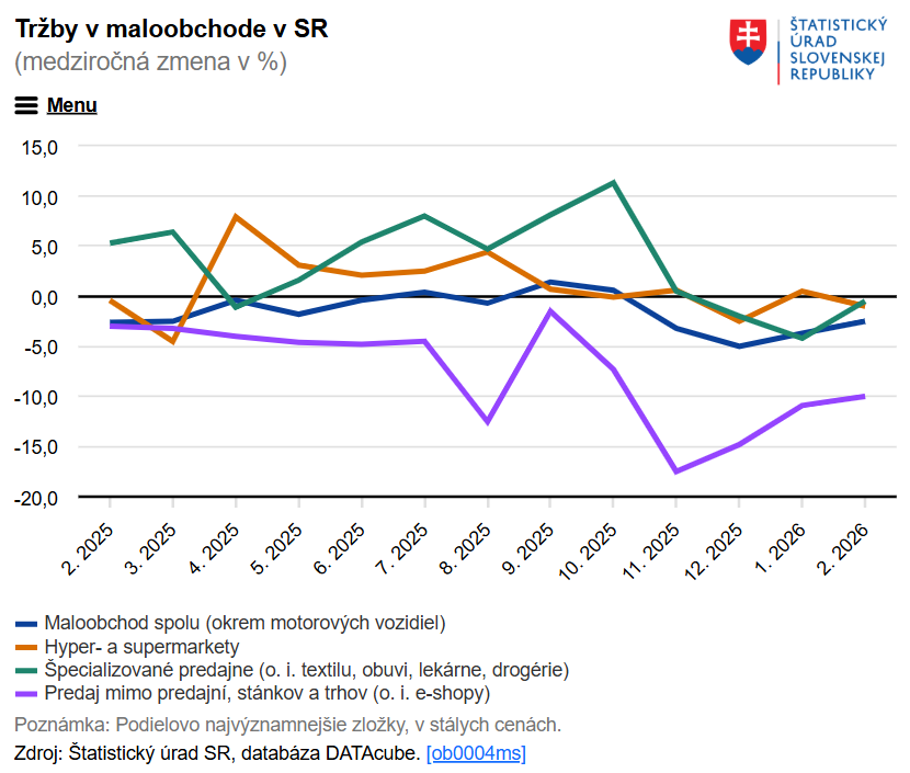 Maloobchod na Slovensku zaznamenal vo februári 2026 medziročný pokles tržieb o 2,5 % po očistení o infláciu, čo predstavuje už štvrtý mesiac po sebe, keď tržby klesajú v reálnych cenách. Pokles postihol väčšinu segmentov maloobchodu, najmä e-shopy a zásielkový predaj, kde sa medziročný pokles vyšplhal až na 10 %.