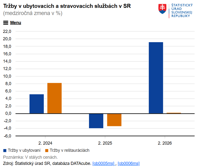 Ubytovanie a stravovanie: vo februári 2026 vzrástli tržby o 19,2 % v ubytovaní a o 0,3 % v reštauráciách a pohostinstvách.